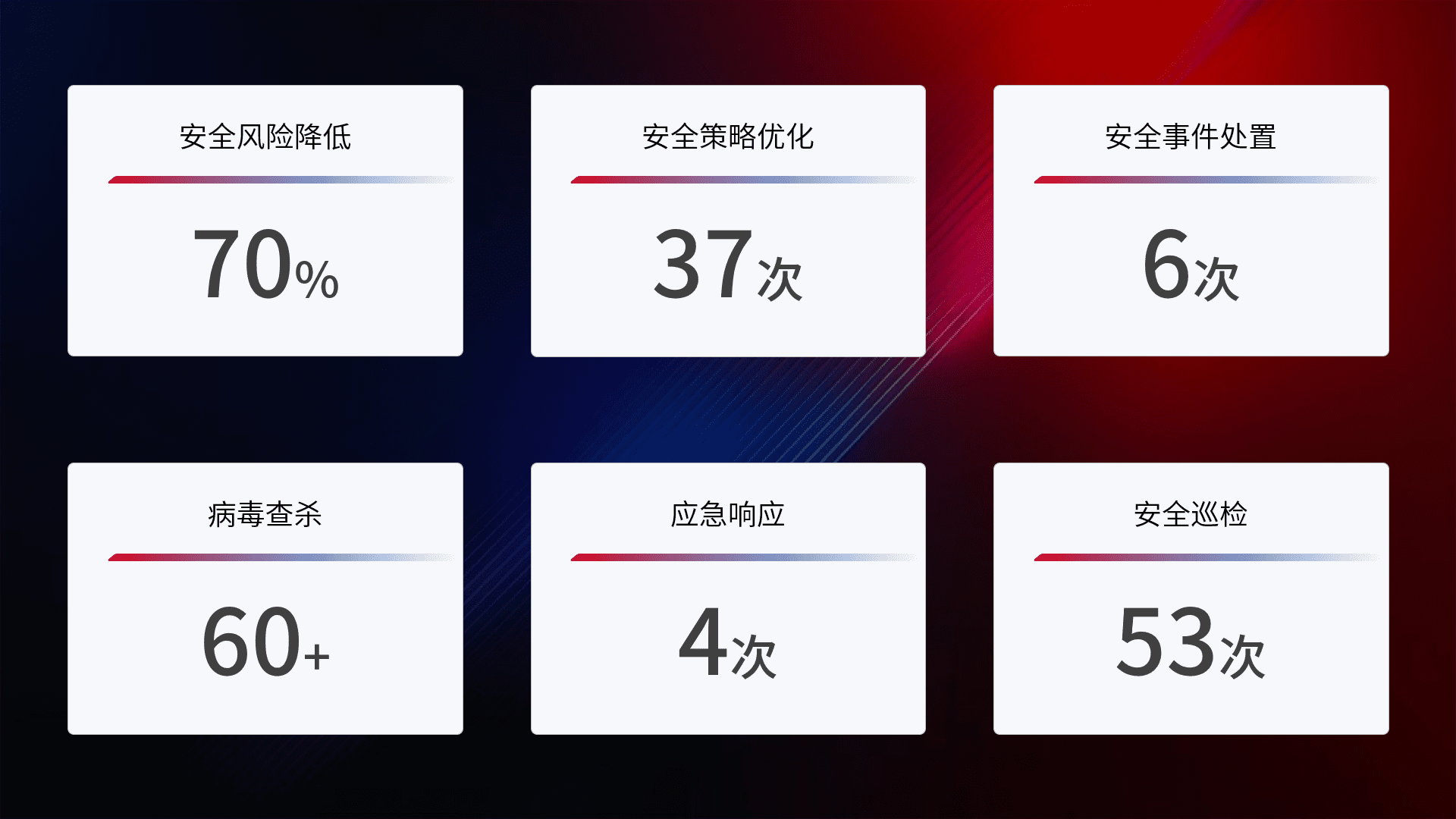 提供全面的安全事件报告体系,,,,包括处置报告、、、、周报、、、季度和年度总结,,,,结合持续监控,,,帮助客户深入了解网络安全状况。。。。